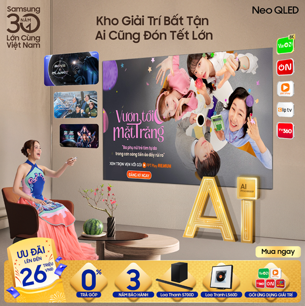 Mừng Tết Bính Ngọ 2026 và cột mốc 30 năm hoạt động tại Việt Nam, Samsung triển khi chương trình ưu đãi lên đến 26 triệu khi mua TV của hãng trong Tết này. Người dùng sẽ nhận được ưu đãi lên đến 26 triệu đồng, tặng loa thanh S700D hoặc loa tranh LS60D, bảo hành 3 năm, trả góp 0% cùng gói ứng dụng giải trí.